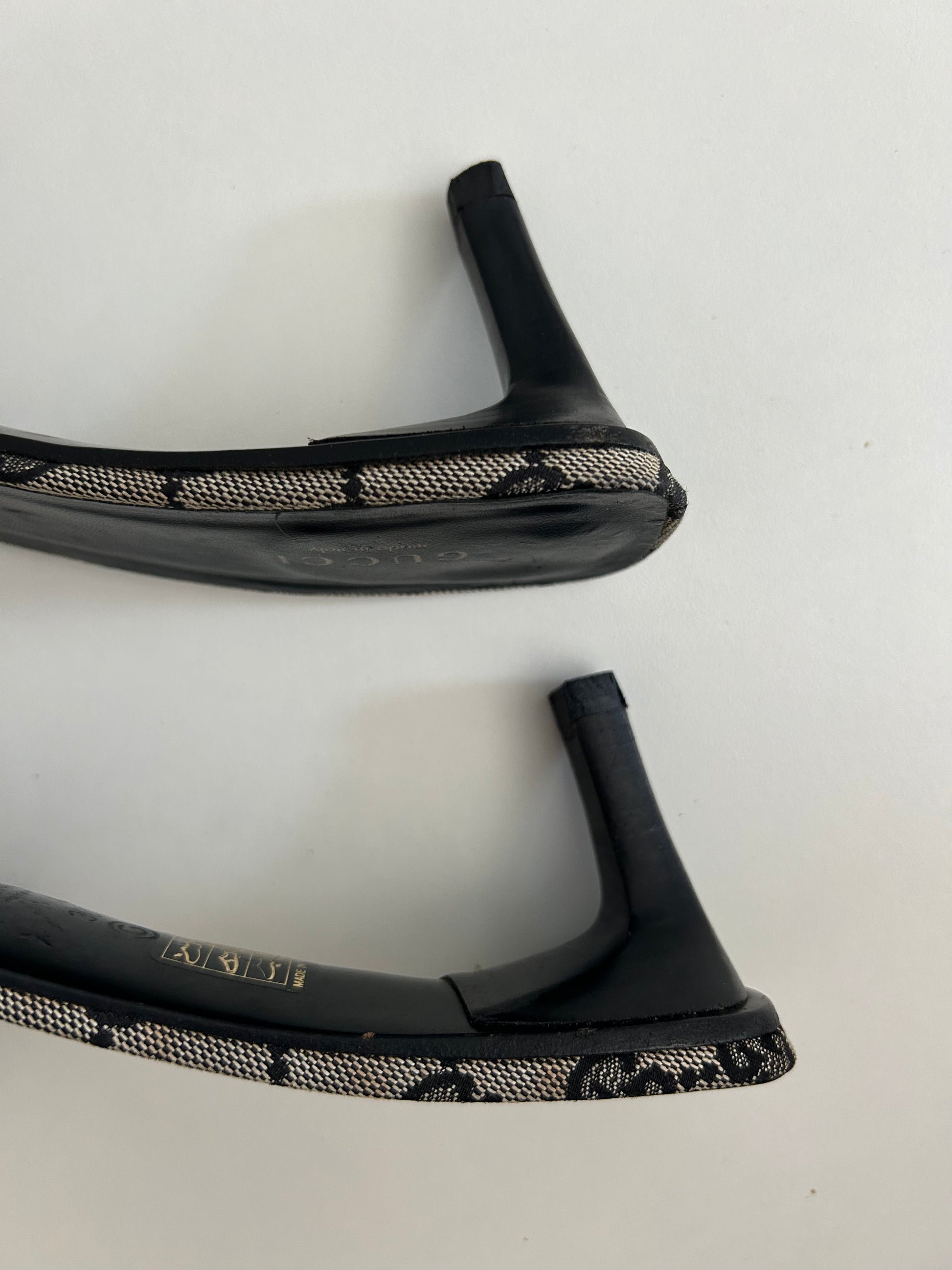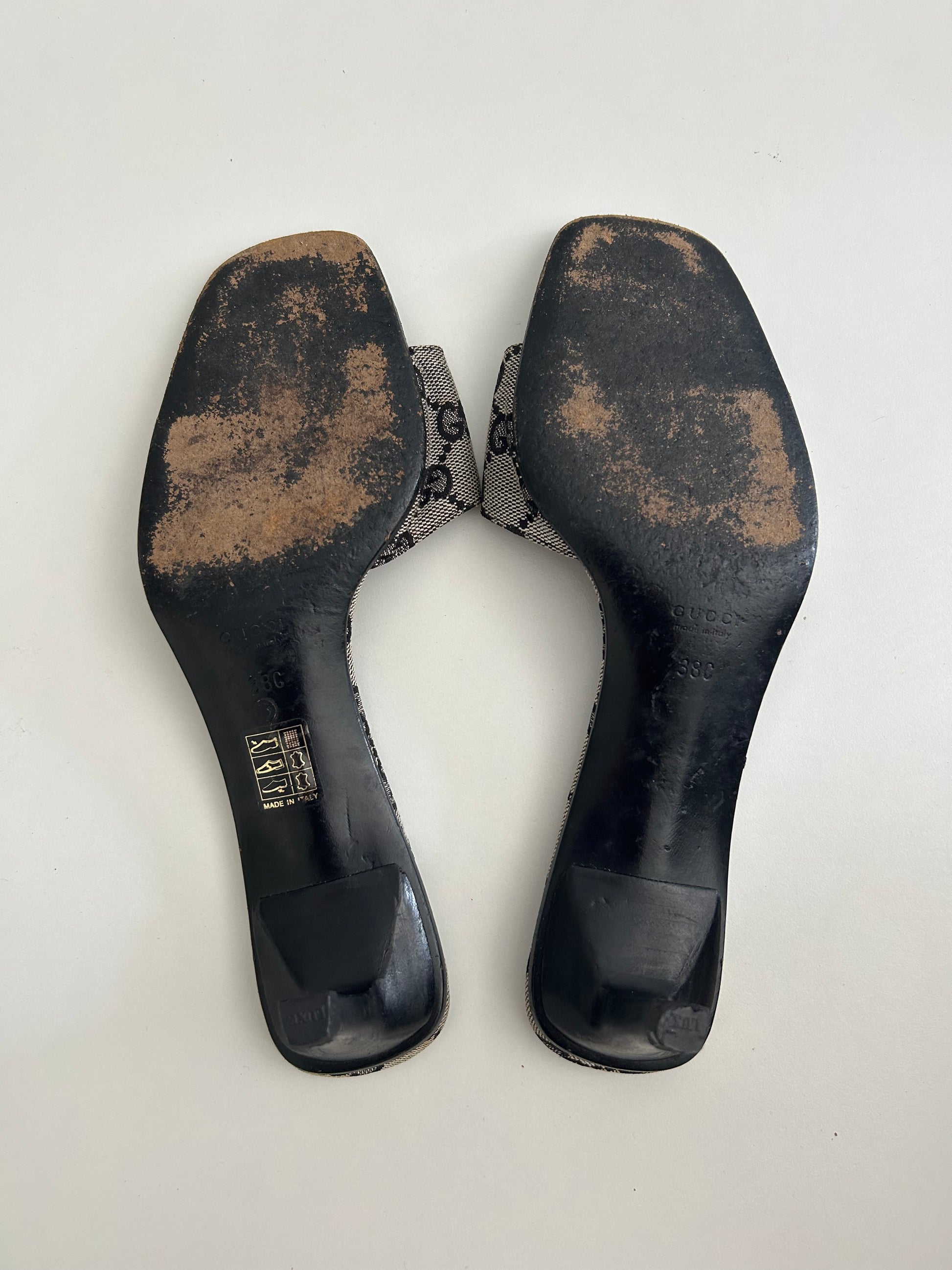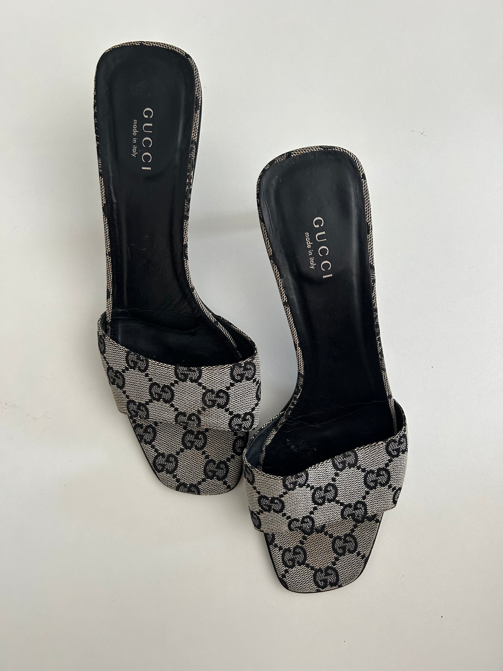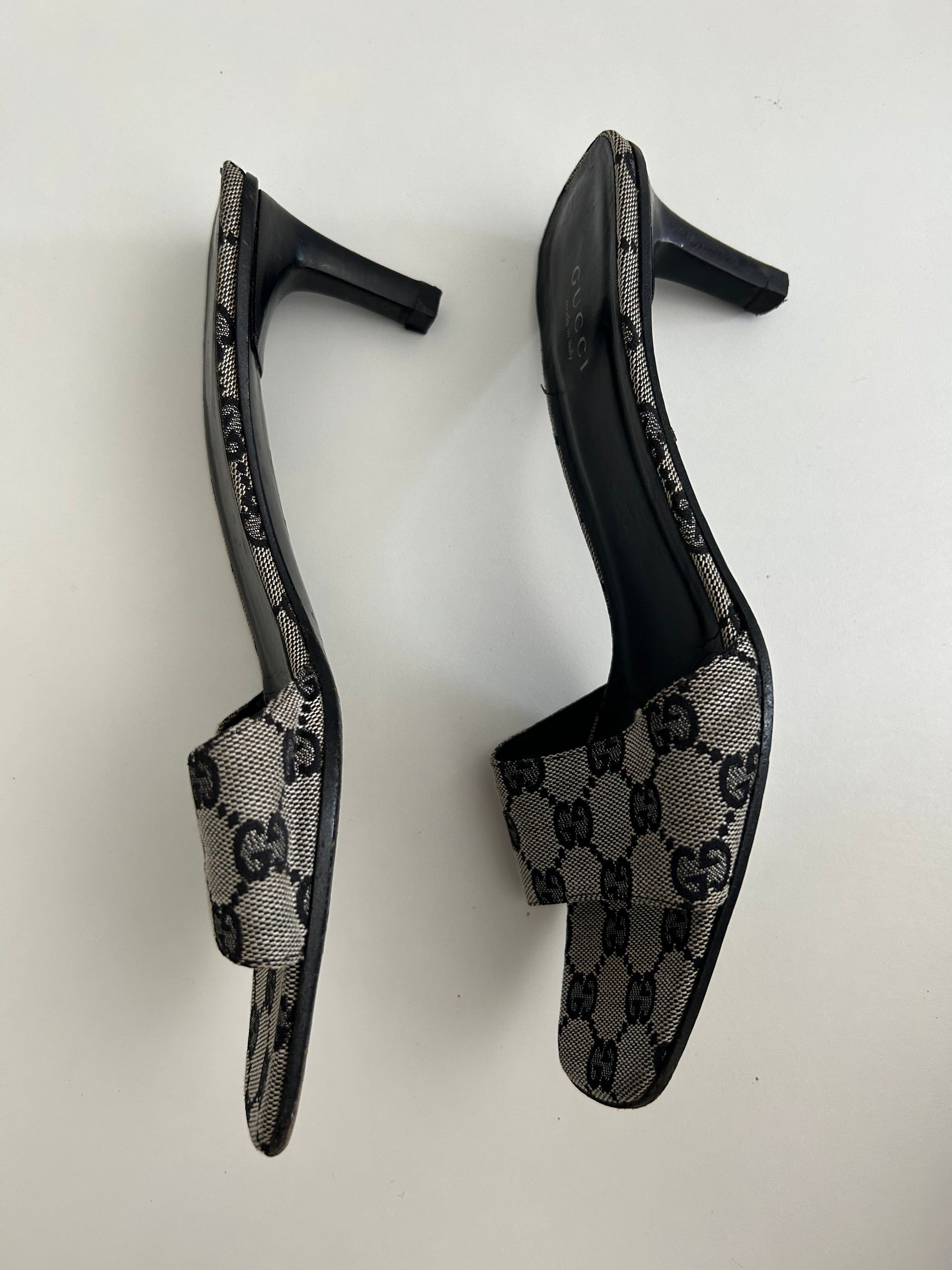 Vintage Gucci Canvas mules with black monogram logo.